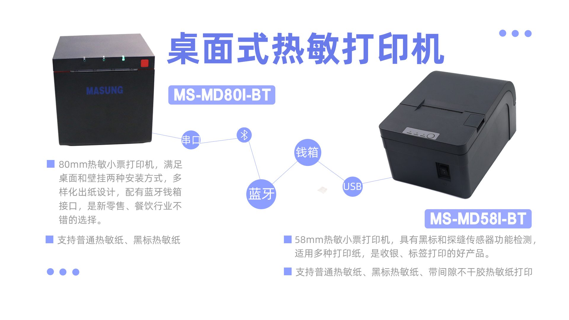 這兩款新發(fā)布的桌面小票打印機(jī),一款是80mm熱敏小票打印機(jī),滿足桌面和壁掛兩種安裝方式,多樣化出紙?jiān)O(shè)計(jì),配有藍(lán)牙錢箱接口,是新零售、餐飲行業(yè)不錯(cuò)的選擇。另一款是58mm熱敏小票打印機(jī),具有黑標(biāo)和探縫傳感器功能檢測,適用多種打印紙(普通熱敏紙,黑標(biāo)熱敏紙,帶間隙不干膠標(biāo)簽熱敏紙),是收銀、標(biāo)簽打印的好產(chǎn)品。