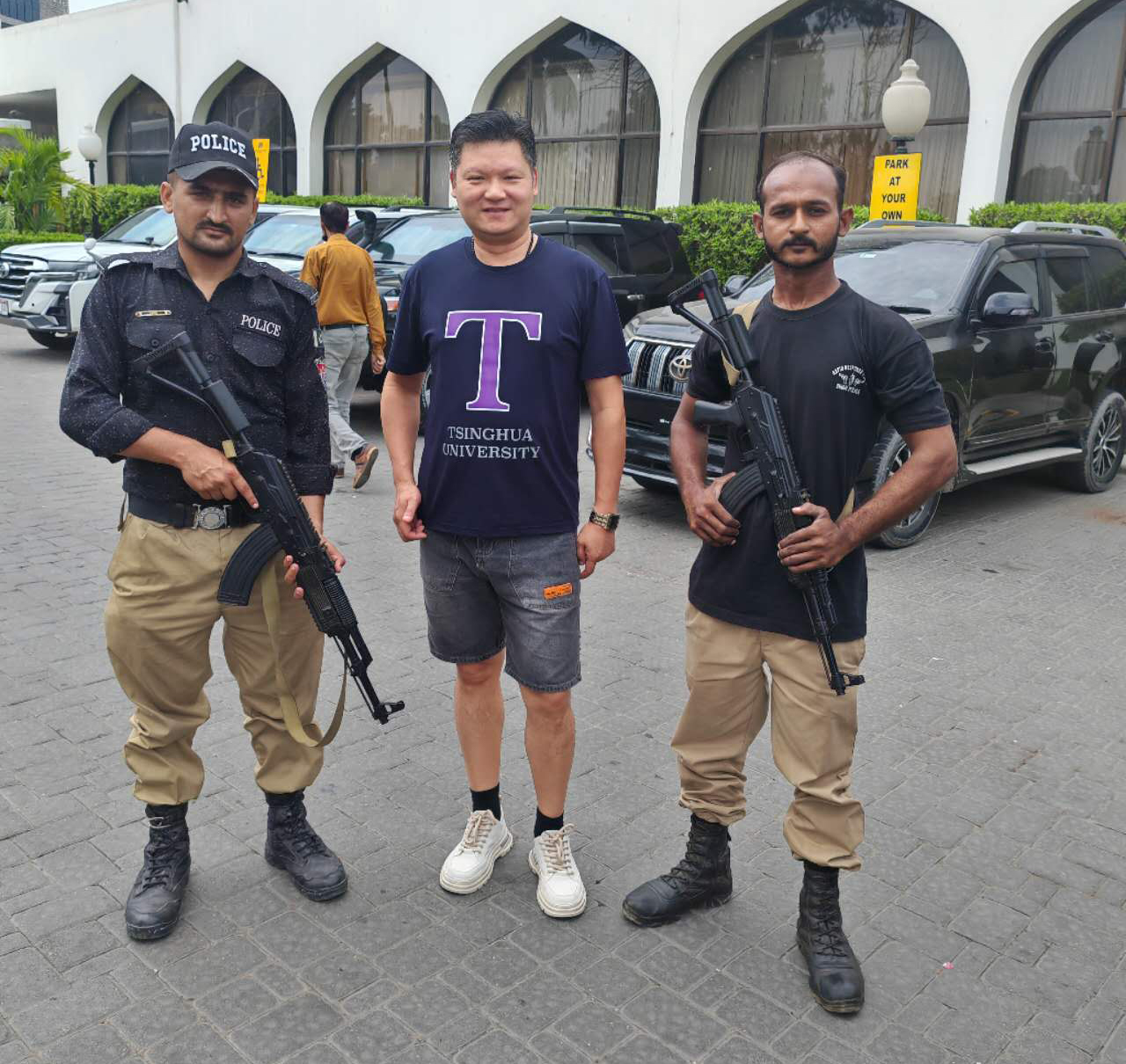 談到中巴友誼,政府部門的工作細致服務(wù)到位,用圖說話,他們用實際行動保護著每一個中國公民的出行安全,無不彰顯中巴鐵桿兄弟情誼,瞧!警察同志開著警車手持真槍實彈護送美松集團陳董事長前往展館布展。