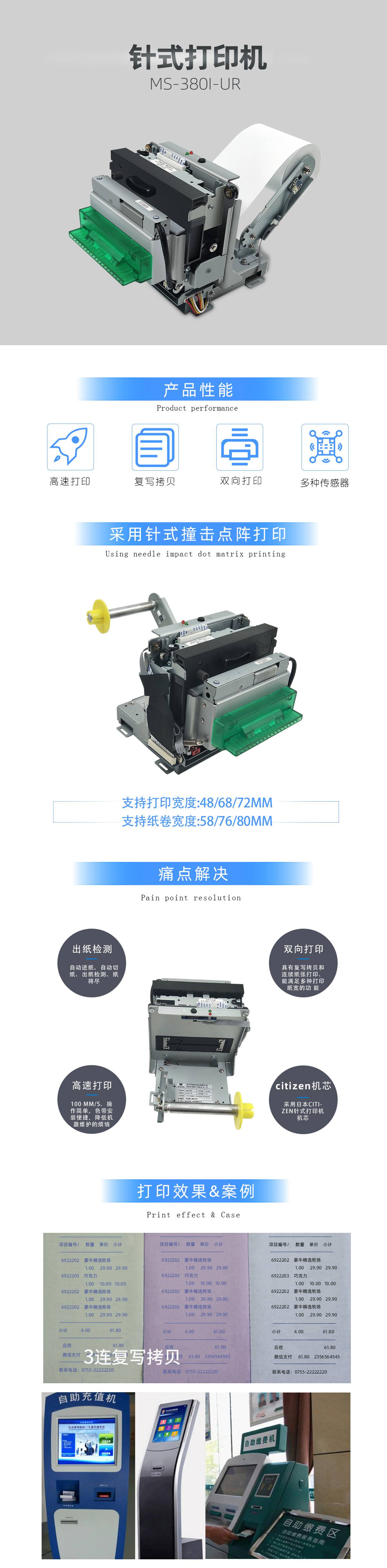 美松嵌入式針式票據(jù)打印機 MS-380I-UR打印一體機是由日本citizen針式打印機機芯,與公司自主研發(fā)的針式打印機控制主板相結合的一款打印一體機。是一種針式撞擊點陣打印方式的打印機,可靠性強,具有復寫拷貝和連續(xù)紙張打印、能滿足多種打印紙寬的功能,控制板結構小巧,操作簡單,色帶安裝便捷,降低機器維護的煩惱。