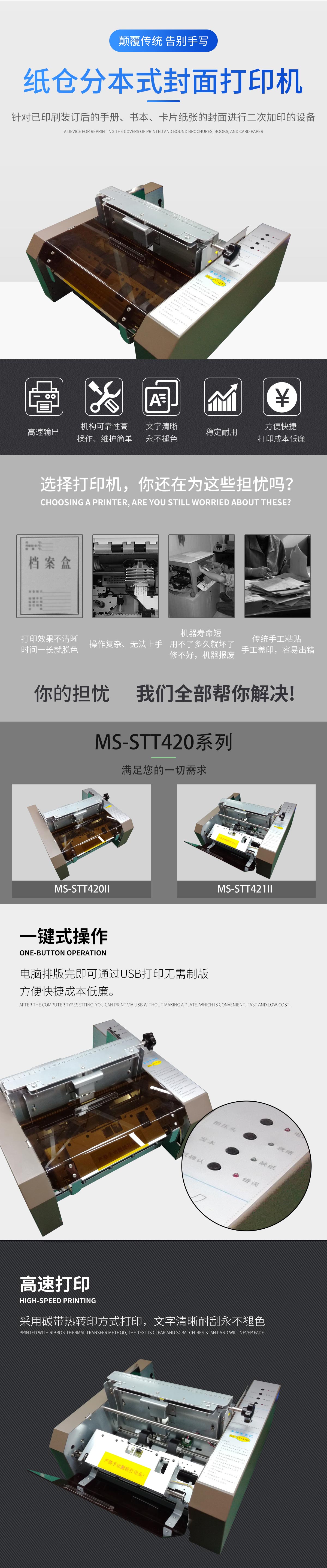 美松MS-STT420II是熱轉(zhuǎn)印設備,利用熱轉(zhuǎn)印技術,實現(xiàn)紙倉分本式封面打印機針對已印刷裝訂后的手冊,書本,卡片紙張的封面進行二次加印的設備.采用碳帶熱轉(zhuǎn)印方式打印,文字清晰耐刮永不褪色.電腦排版完即可通過USB打印無需制版,方便快捷成本低廉.可調(diào)打印件厚度及可調(diào)紙倉式多本裝入,機構可靠性高,操作,維護簡單.