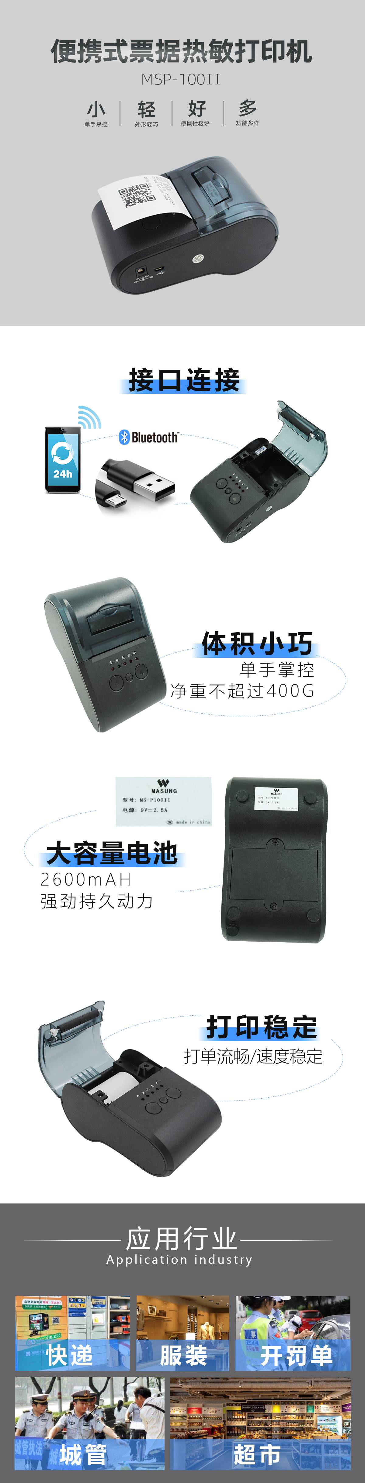美松MASUNG自主研發(fā)POS小票打印機 1.支持多種一維條形碼&二維碼功能的打印 2.支持GB18030漢字庫,可高速打印漢字 3.接口類型:藍牙,mircoUSB