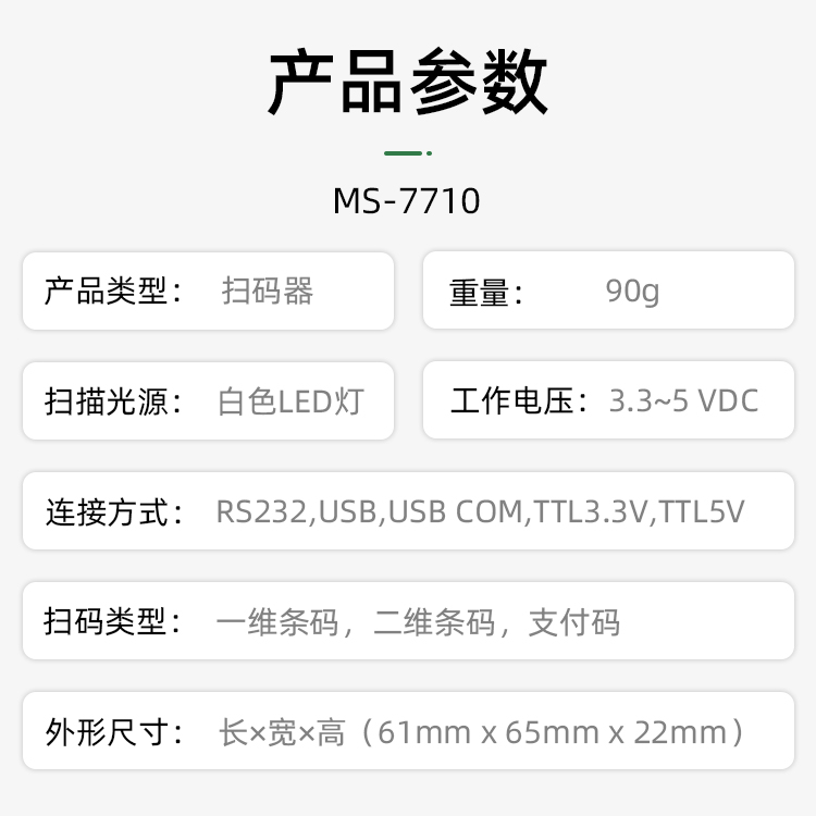 美松二維碼掃描模塊產(chǎn)品特性 1.快速識(shí)別紙質(zhì)和屏幕條碼,破損污損二維碼均能識(shí)讀 2.接口豐富,內(nèi)置RS232,USB,TTL5V,TTL3.3V 3.高集成度,21mm厚小機(jī)身,非常方便的用于高度集成應(yīng)用環(huán)境 4.綠色低功耗,產(chǎn)品使用壽命長(zhǎng);數(shù)據(jù)傳輸更加安全可靠 5.采用核心解碼技術(shù),可快速識(shí)讀各類紙質(zhì),塑料卡,屏幕條形碼,二維碼 6.圖像采集器與解碼板一體化 設(shè)計(jì),體積小,重量輕,可適應(yīng)各種集成應(yīng)用