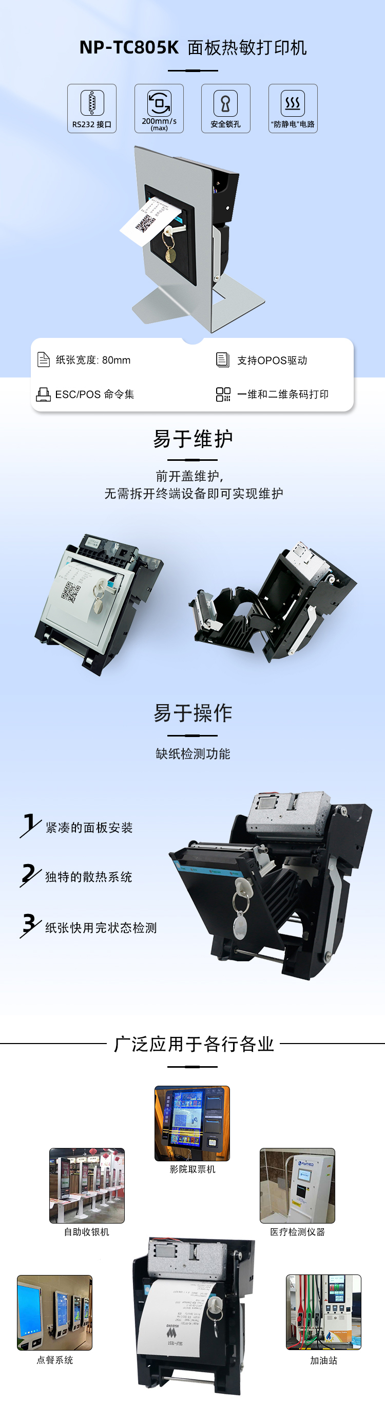 1.超薄機(jī)身設(shè)計(jì),專用于高度集成的終端服務(wù)設(shè)備 2.紙倉(cāng)最大化設(shè)計(jì),80*80大紙卷,避免頻繁換紙 3.開(kāi)蓋方式多樣化:按鍵,鑰匙和電子鎖開(kāi)蓋 4.前維護(hù)式,不需要打開(kāi)機(jī)柜換紙 5.分為有邊框和無(wú)邊框,無(wú)邊框更易嵌入在終端服務(wù)設(shè)備