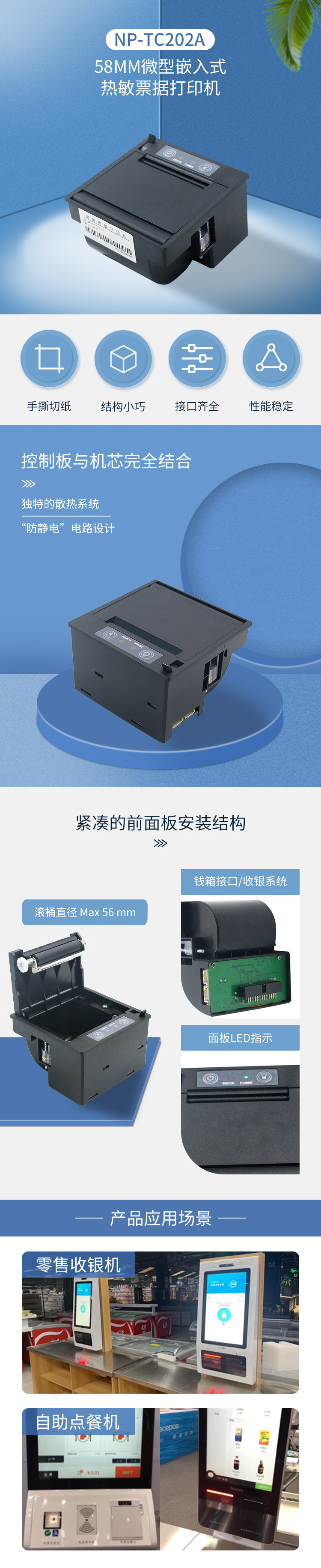 1.易裝紙結(jié)構(gòu) 2.低噪音熱敏打印 3.可選不同的接口 4.支持圖文打印 5.紙卷60毫米外徑紙卷 6.大齒輪、大膠輥、大馬達(dá)機(jī)芯設(shè)計(jì)耐用可靠 7.支持Web打印,以及多種驅(qū)動(dòng)Windows,Linux,Android