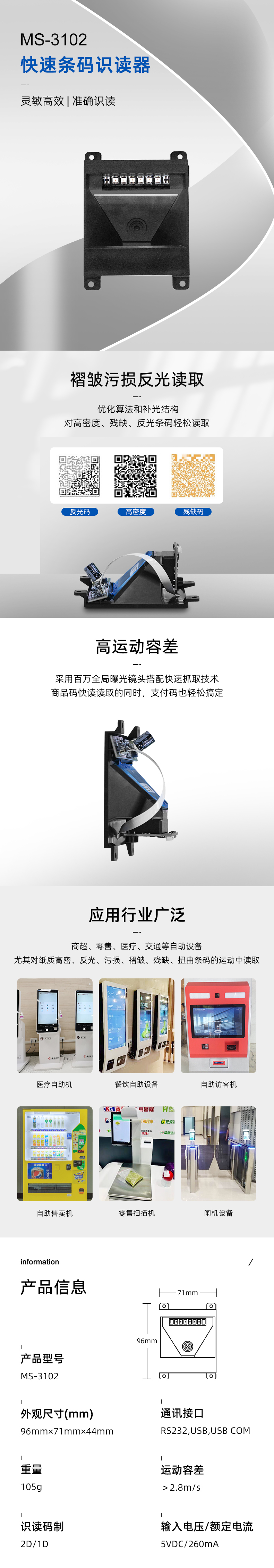 領(lǐng)先解碼技術(shù) 采用自主研發(fā)的核心技術(shù),極速響應(yīng),支持快速開發(fā)和定制需求 高運動容差 采用百萬全局曝光鏡頭搭配快速抓取技術(shù),實現(xiàn)在運動過程中快速讀取 支持商品碼和支付碼 針對商超零售場景特殊優(yōu)化,商品碼快讀讀取的同時,支付碼也輕松搞定 褶皺污損反光讀取 優(yōu)化算法和補光結(jié)構(gòu),對高密度、殘缺、反光條碼輕松讀取