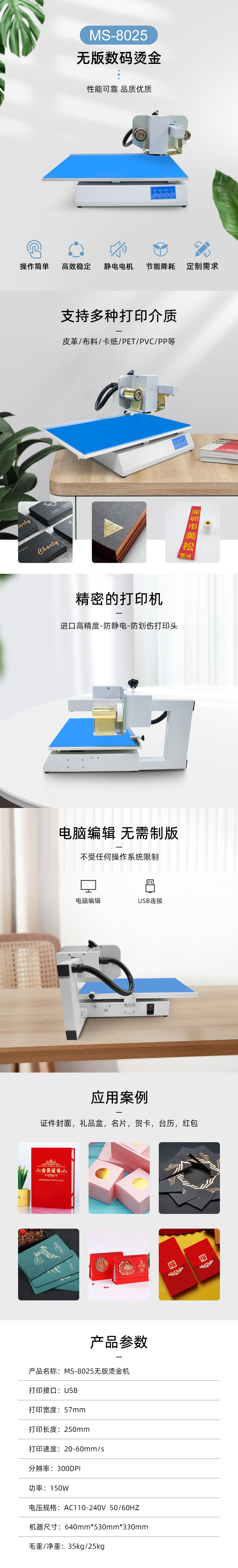 美松無(wú)版數(shù)碼燙金機(jī)MS-8025采用日本原裝rohm打印頭,最新設(shè)計(jì)徹底取代傳統(tǒng)的燙金機(jī)。身材小巧、節(jié)約空間重量、方便移動(dòng);最大打印厚度可達(dá)30mm、用途廣泛。軟件控制、可加工復(fù)雜圖案文字照片等,可在不光滑的卡紙、皮革上燙印各種圖案文字。用戶無(wú)需制版、開模,功率低,經(jīng)濟(jì)快捷,簡(jiǎn)單操作,一看即懂,輕松自如。