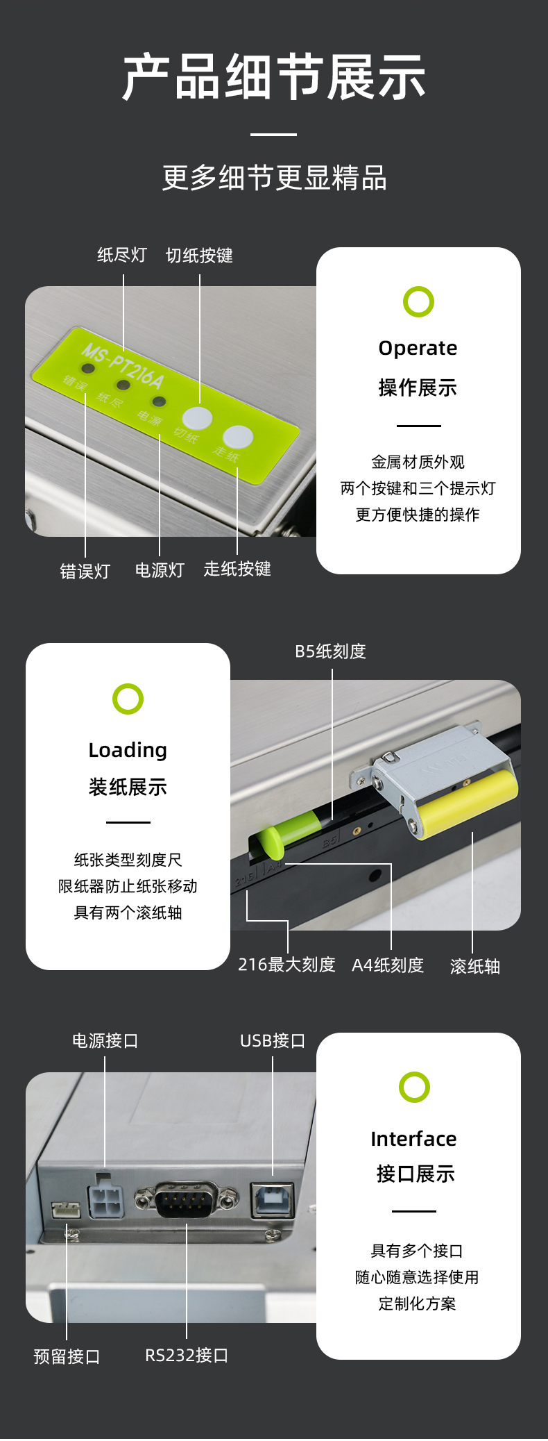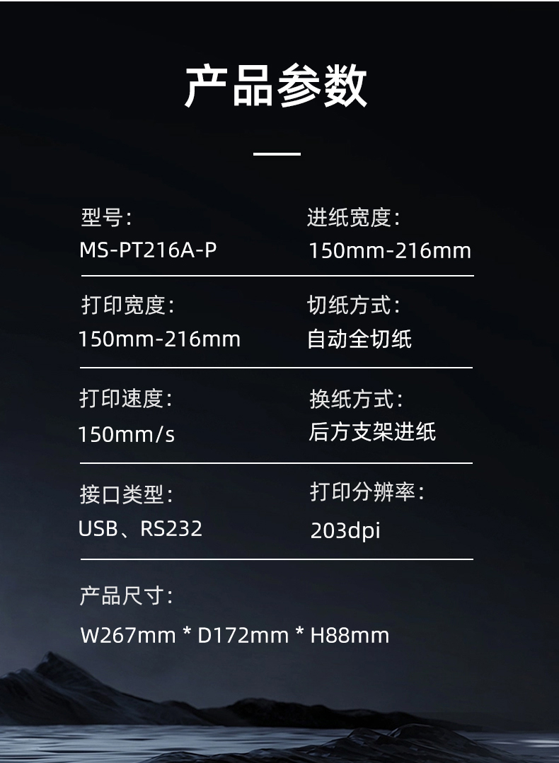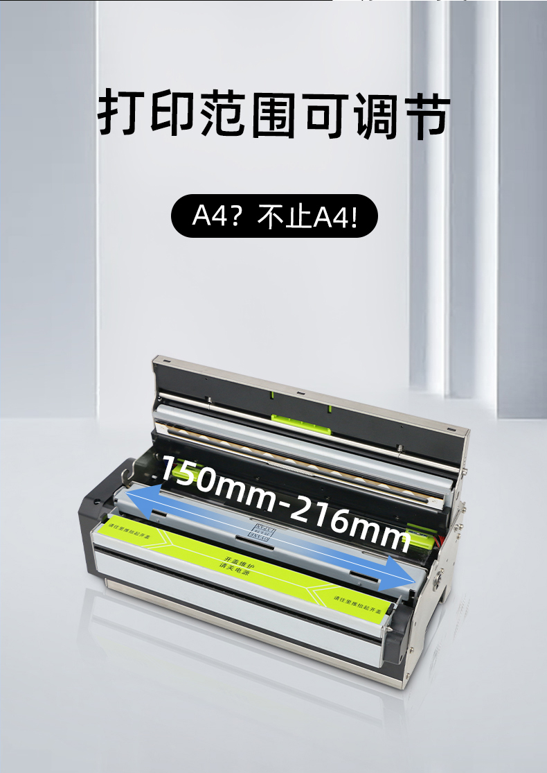 MS-PT216A-P_A4熱敏打印機(jī), 一款全新大幅面熱敏打印機(jī),打印寬度150mm-216mm可調(diào)節(jié)。 體積尺寸相比同類(lèi)產(chǎn)品更為小巧。 打印速度可達(dá)150mm/s 有效容紙,杜絕打印過(guò)程中拉扯造成的卡紙 先打印完成并切紙,一次性把紙送出 容紙器可開(kāi)蓋,維護(hù)方便快捷
