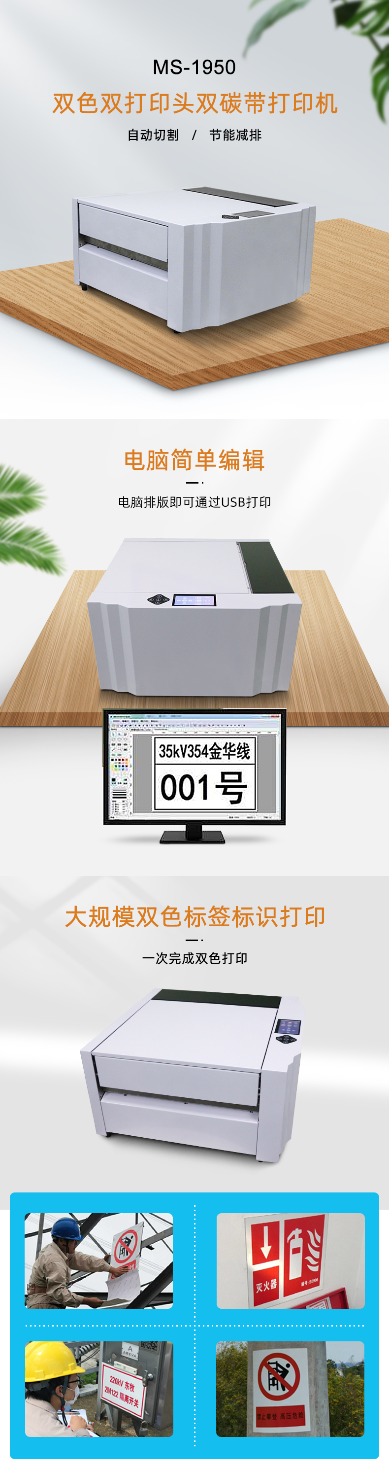美松MASUNG自主研發(fā)熱轉(zhuǎn)印雙色標(biāo)識(shí)牌打印機(jī) 1.打印大幅面標(biāo)示牌,且自動(dòng)切割 2.無(wú)需制版,電腦排版完通過(guò)USB打印,方便快捷 3.碳帶熱轉(zhuǎn)印方式打印,文字清晰耐刮永不褪色 4.支持PVC+貼合鋁箔復(fù)合材料、PVC標(biāo)識(shí)貼紙材料等打印 5.熱轉(zhuǎn)印打印防水防曬耐腐蝕,經(jīng)久耐用