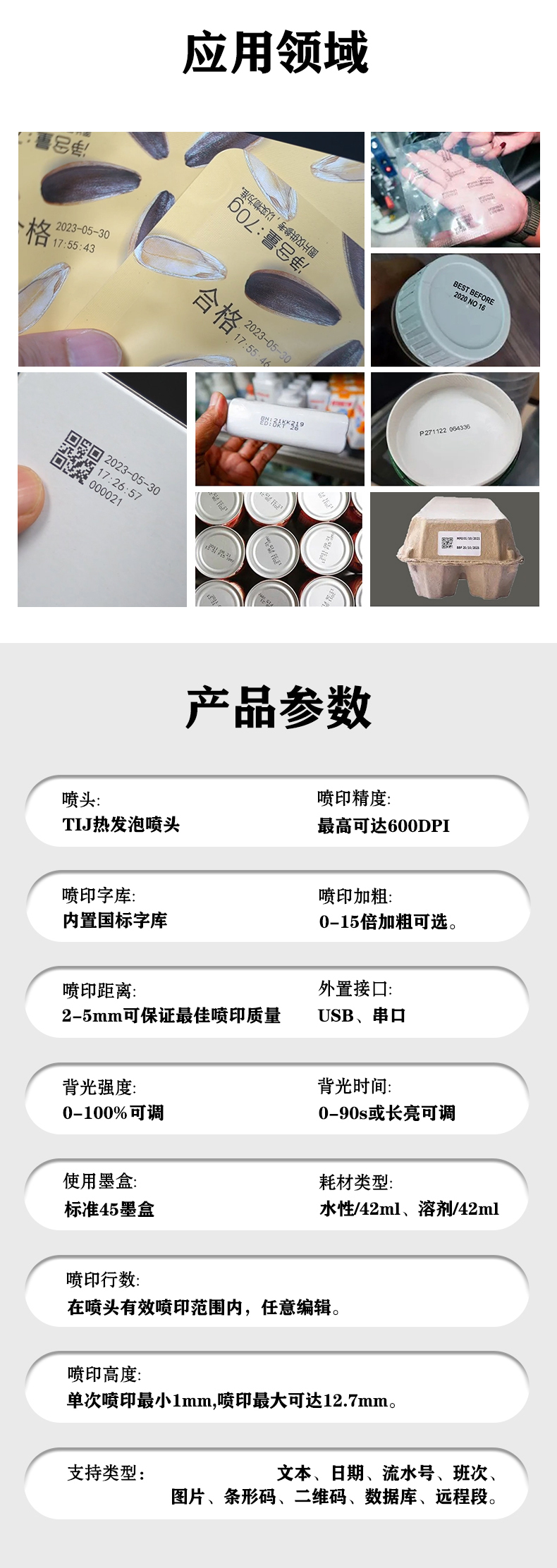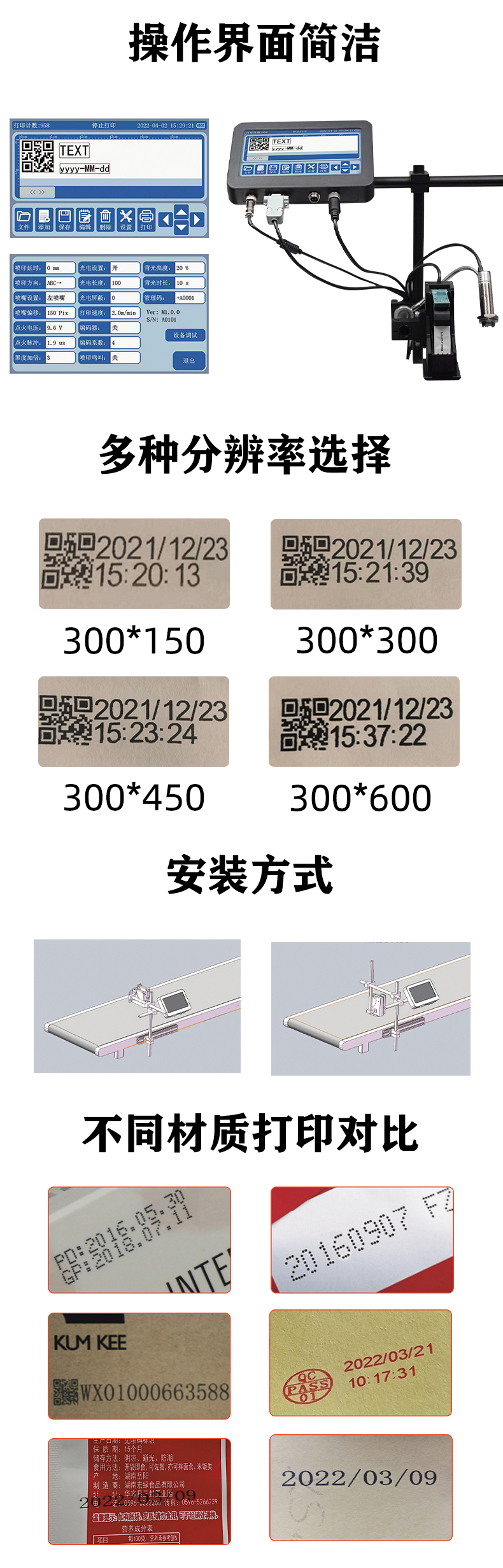 1、進口核心主控,高速穩(wěn)定。 2、靈活多變的噴頭設(shè)計,可同時兼容一寸半寸。 3、全金屬機身和噴頭,更強的抗干擾能力。 4、打印電壓和脈寬可調(diào),能兼容主流墨盒。 5、自帶清洗程序,方便墨盒清洗、 6、支持最高15倍加粗 7、支持可變數(shù)據(jù)噴印(可選),可通過U盤,rs232,導(dǎo)入數(shù)據(jù) 8、自帶視頻教程,學(xué)習(xí)一目了然。