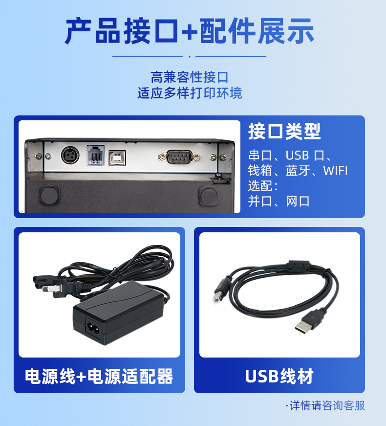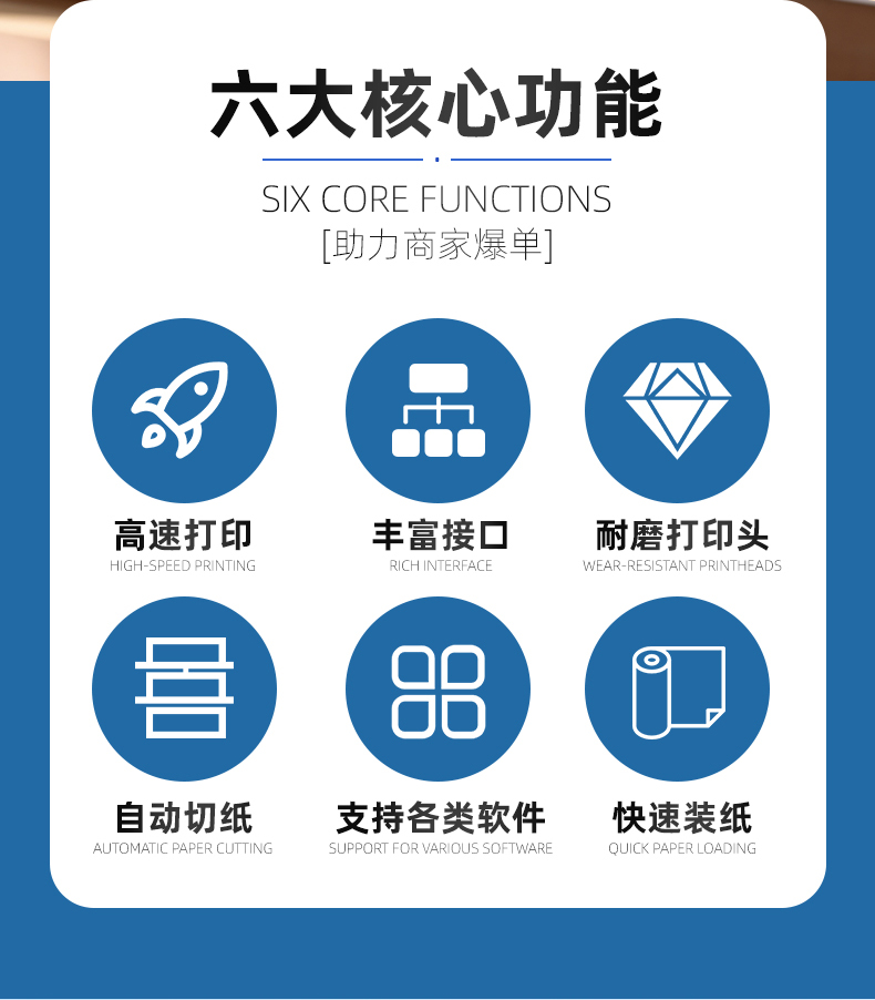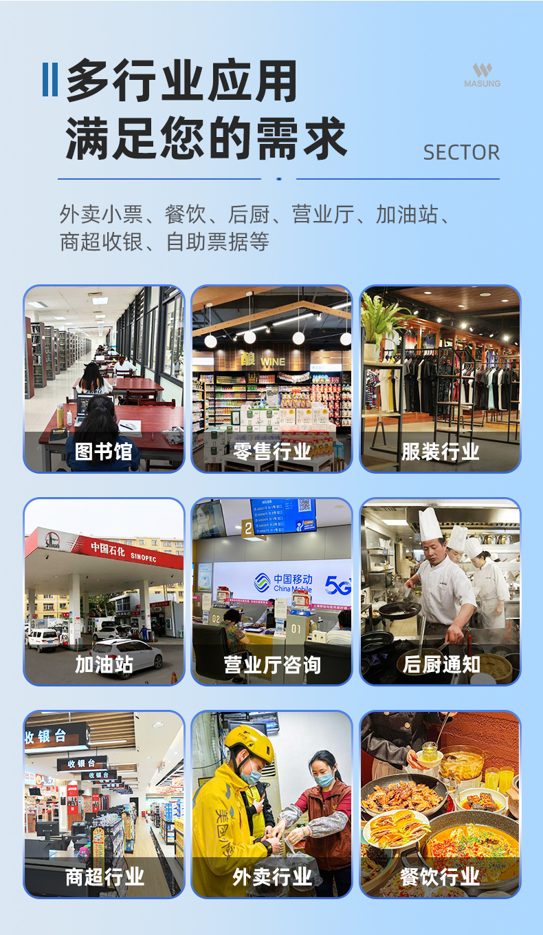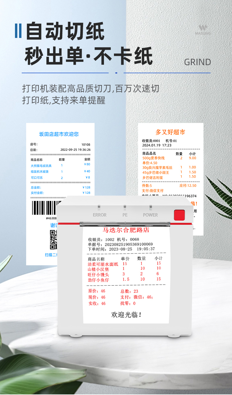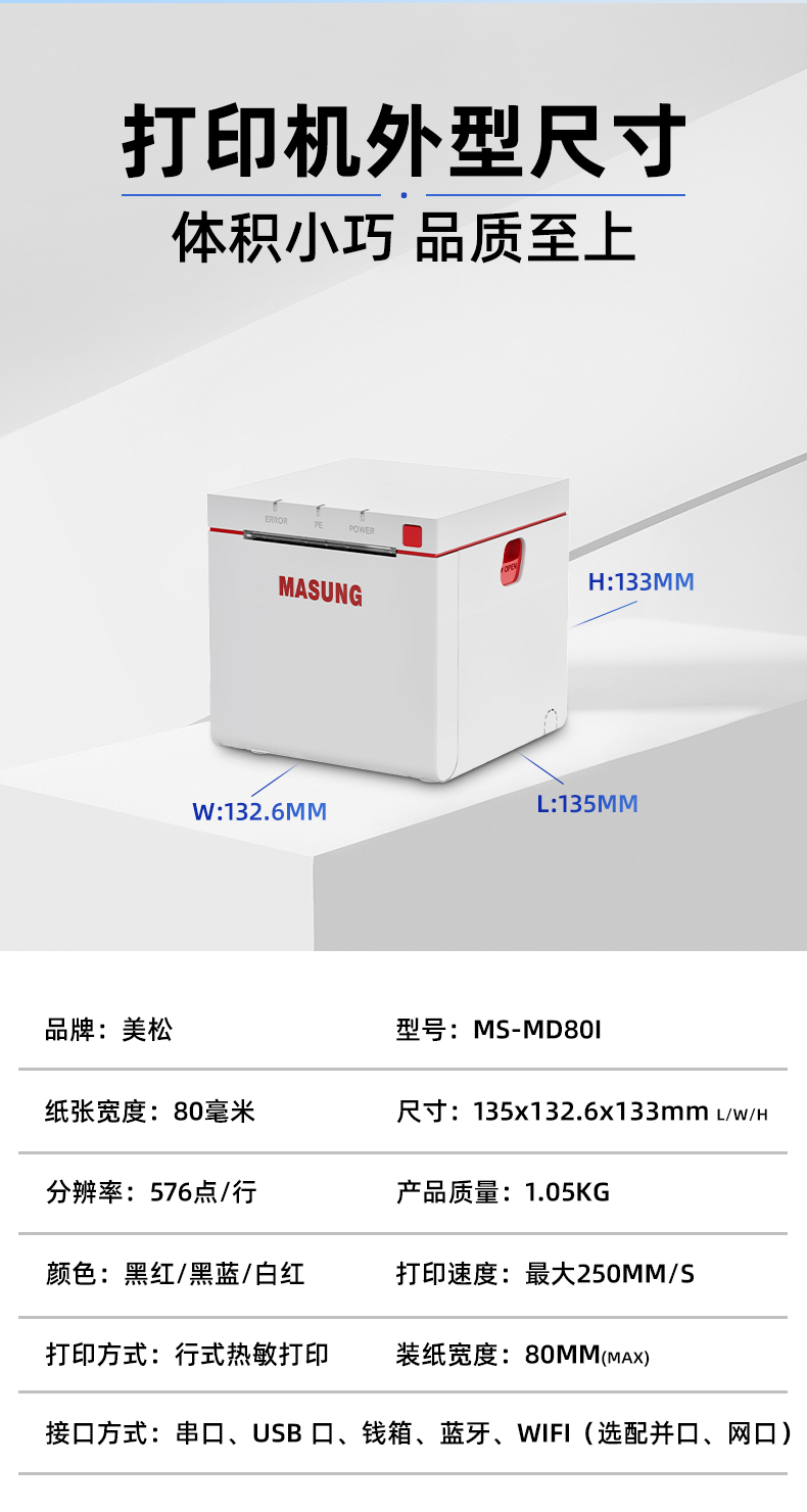 MD80I是一款高顏值的可桌面也可壁掛的票據(jù)打印機。MD80I外形四四方方的,圓潤一體設計、簡于外,精于內。流線造型,外觀簡潔大方。顏色搭配顯得更加干凈整潔,可內嵌于一些自助ai設備上,也可直接進行使用。MS-MD80I是一款全能的桌面式壁掛式票據(jù)打印機,適用于零售商超、中小電商、倉儲物管、影院娛樂等行業(yè)領域,支持簡體/繁體、英/日/韓文多種國際語言,新零售、跨境電商、影院更適合。MS-MD80I擁有超高速打印速度,采用高級強勁機芯,打印速度可高達250MM/S成為市面上同類產品中快速打印的佼佼者,清晰穩(wěn)定與高速皆可兼得帶來顧客滿分體驗。MS-MD80I擁有豐富的可選接口,支持RS232串口、USB、網口,可選配藍牙、WiFi等接口、同時支持24V錢箱接入、滿足不同的連接需求。專業(yè)黑標定位功能,前出紙打印,無線連接,藍牙接口連接,WiFi接口連接,USB連接,打印機外殼材質高端,內置機芯打印速度快。