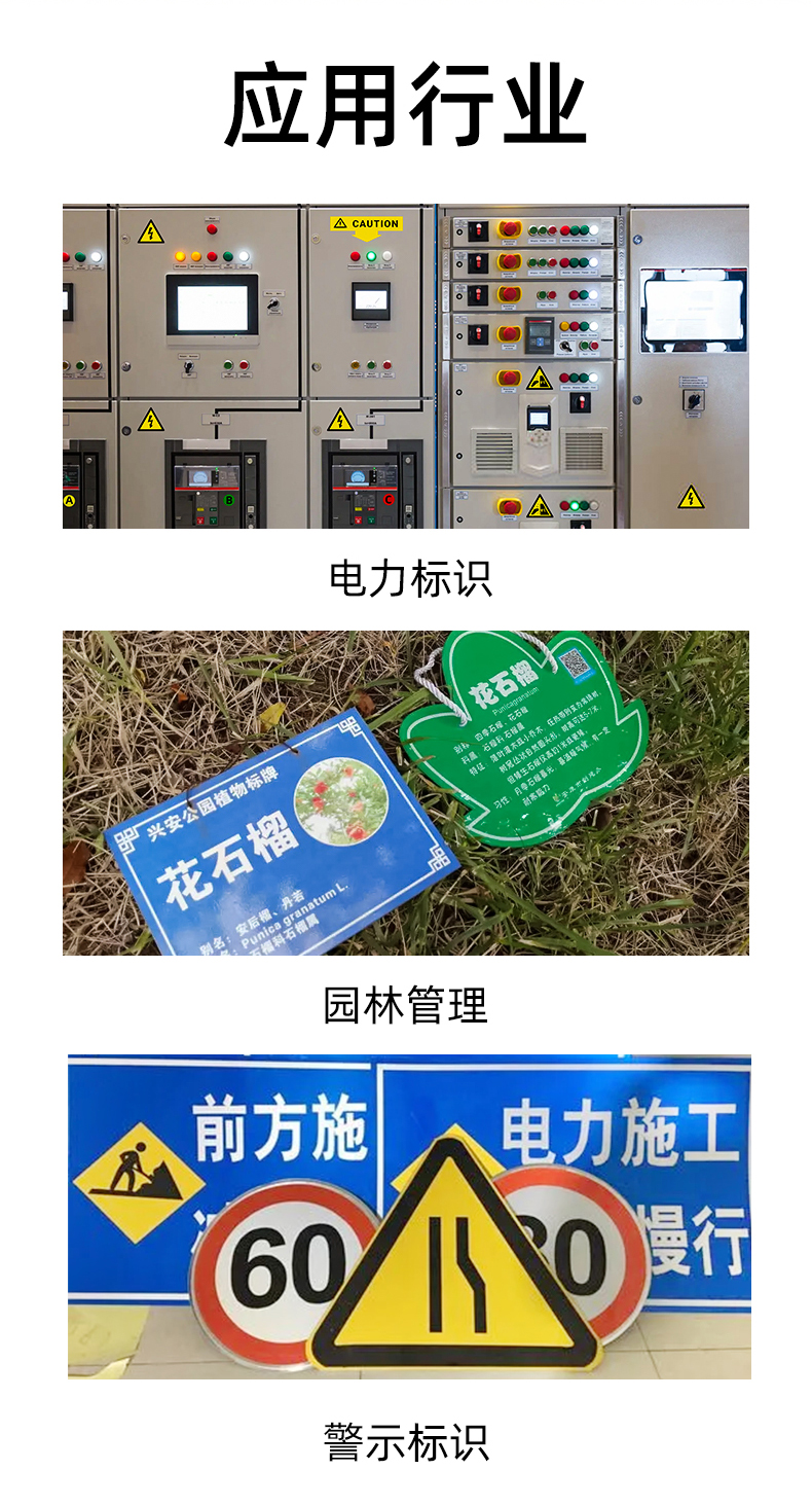 應(yīng)用于多種行業(yè),比如電力標(biāo)識(shí)標(biāo)牌,施工危險(xiǎn)警示標(biāo)識(shí)標(biāo)牌,園林管理標(biāo)牌,樹(shù)木介紹標(biāo)牌,道路標(biāo)識(shí)標(biāo)牌