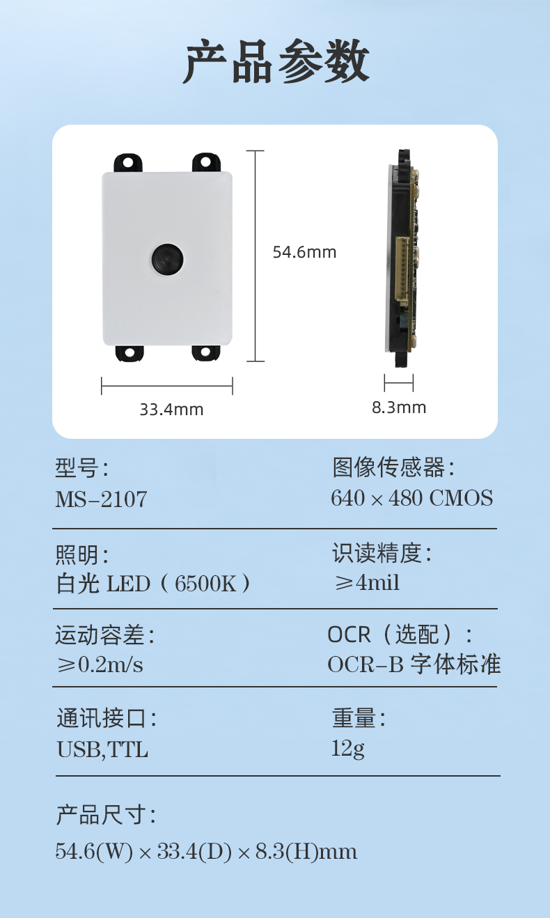 采用自主研發(fā)的核心技術,極速響應,支持快速開發(fā)和定制需求 角度設計,手機可以貼的更近 整機厚度僅 8.3MM,更方便集成 對高密,低對比度,色彩條碼有較強的解析能力 多種接口協(xié)議:USB、USB COM、TTL232、RS232、TTL3.3V、TTL5V 等接口 集成蜂鳴器、補光燈、端子于一塊核心板,穩(wěn)定 性更高 可選配 OCR-B 規(guī)范字符識讀 車載 POS、閘機、門禁、電商自提柜、藥品售賣柜、自助查詢、排隊叫號、金融、 醫(yī)療、快遞、收銀等自助設備等,對電子屏碼應用場景尤為適合。