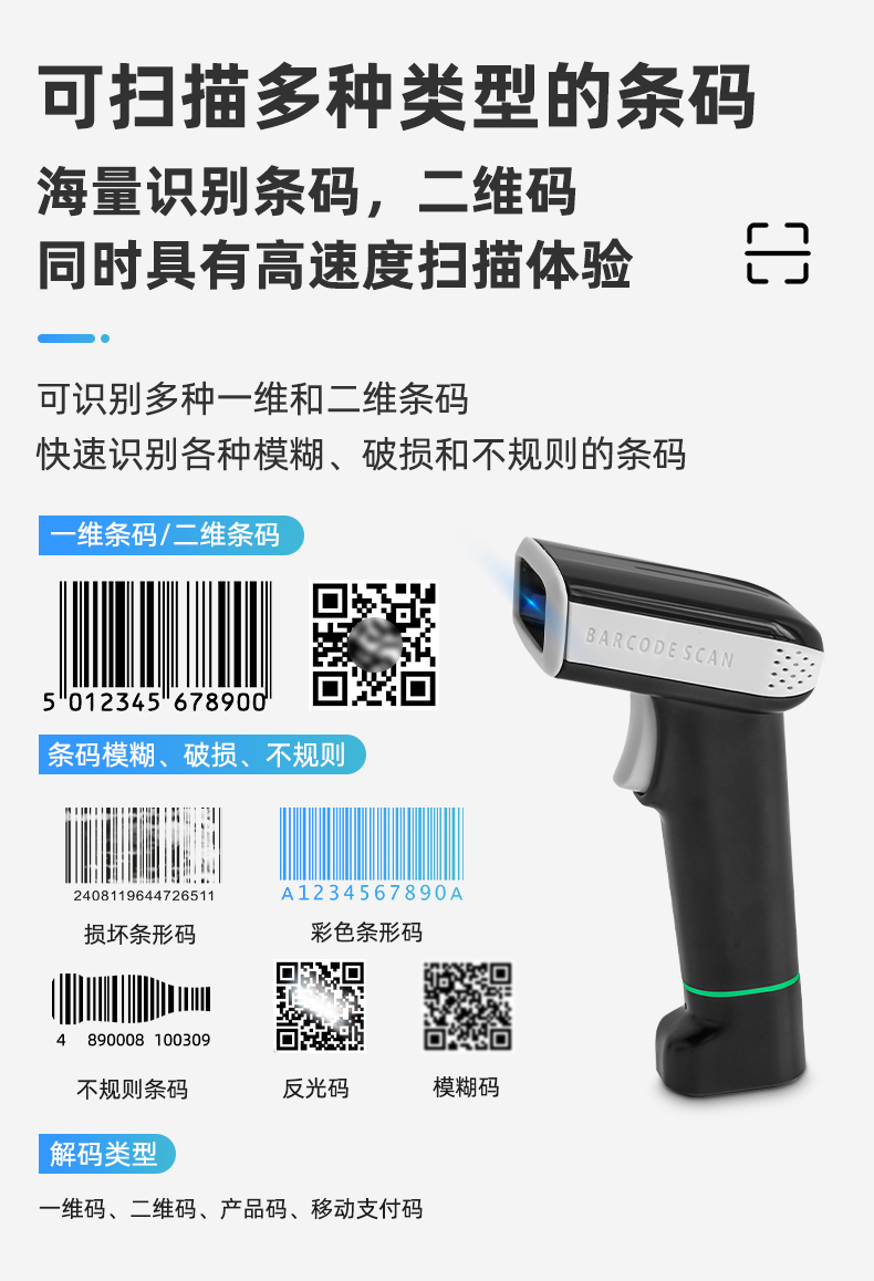 全局高速解碼技術(shù)采用自主研發(fā)的核心技術(shù),極速響應(yīng),支持快速開發(fā)和定制需求 采用二維掃描技術(shù)兼容一維碼和二維碼的讀取 支持多國鍵盤對(duì)不同國家場(chǎng)景可配置對(duì)應(yīng)輸出鍵盤 人體工學(xué)設(shè)計(jì)采用經(jīng)典的人體工學(xué)設(shè)計(jì),符合用戶使用習(xí)慣 手機(jī)和紙質(zhì)條碼讀取采用高速曝光算法,兼容手機(jī)碼和紙質(zhì)碼的快速讀取 應(yīng)用場(chǎng)景: 商超、餐飲、倉儲(chǔ)、追溯、工業(yè)制造、快遞、收銀等場(chǎng)景。