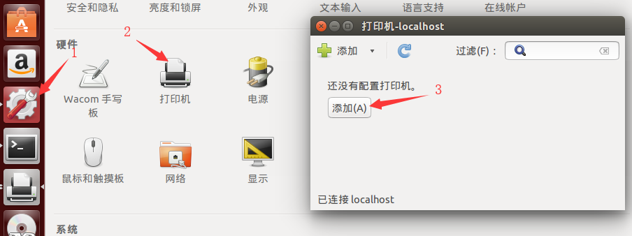 1打開系統(tǒng)設(shè)置,2點擊打印機,3點擊添加。