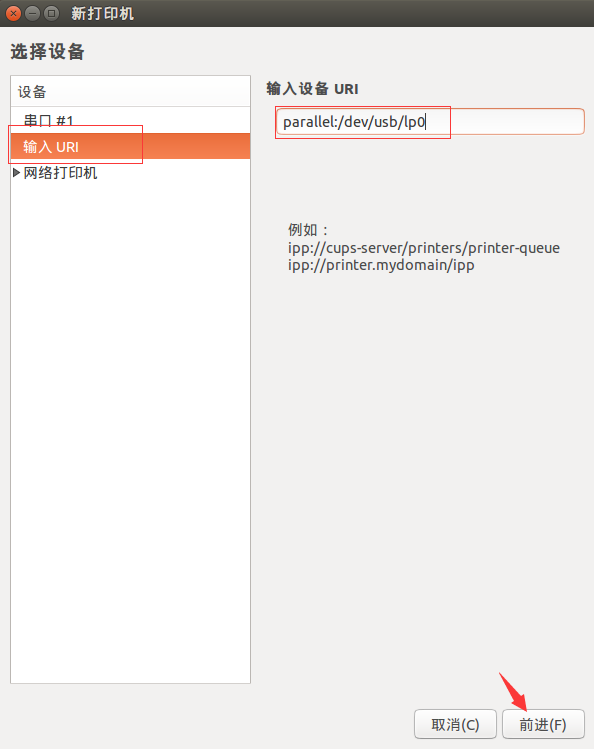 選擇 “輸入URI”,并輸入 “parallel:/dev/usb/lp0”,然后點擊前進。