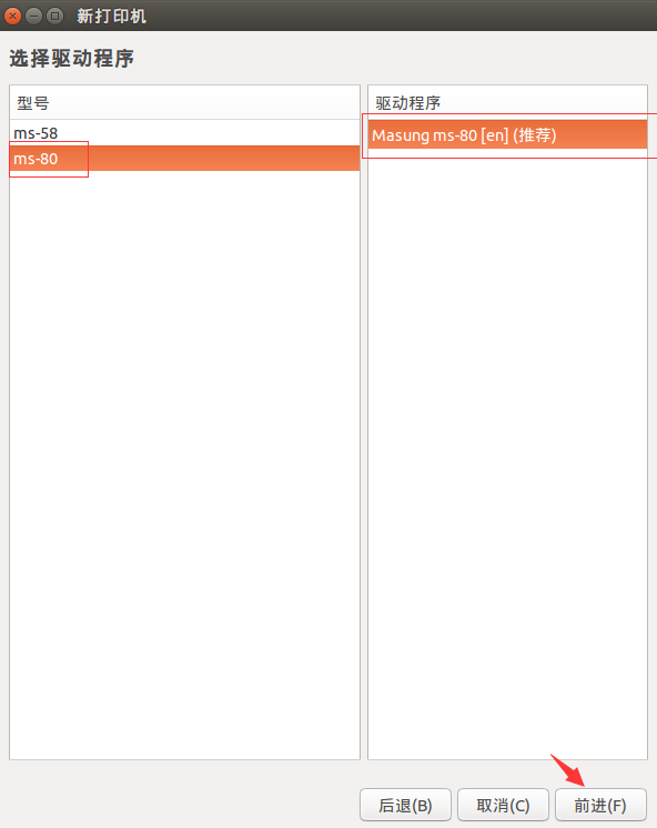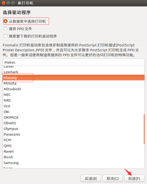 選擇 “從數(shù)據(jù)庫中選擇打印機”,并選擇 “Masung”,然后點擊前進。