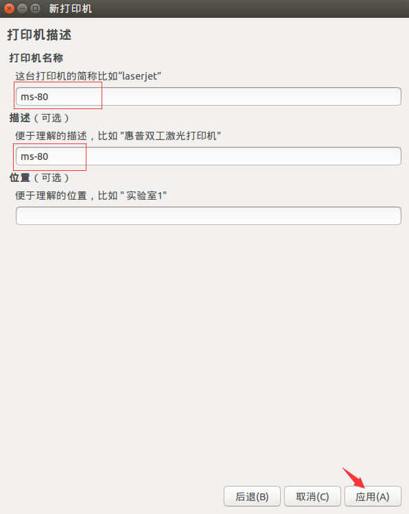 設(shè)置打印機名稱(自定義)和打印機描述(自定義),然后點擊應(yīng)用即可。